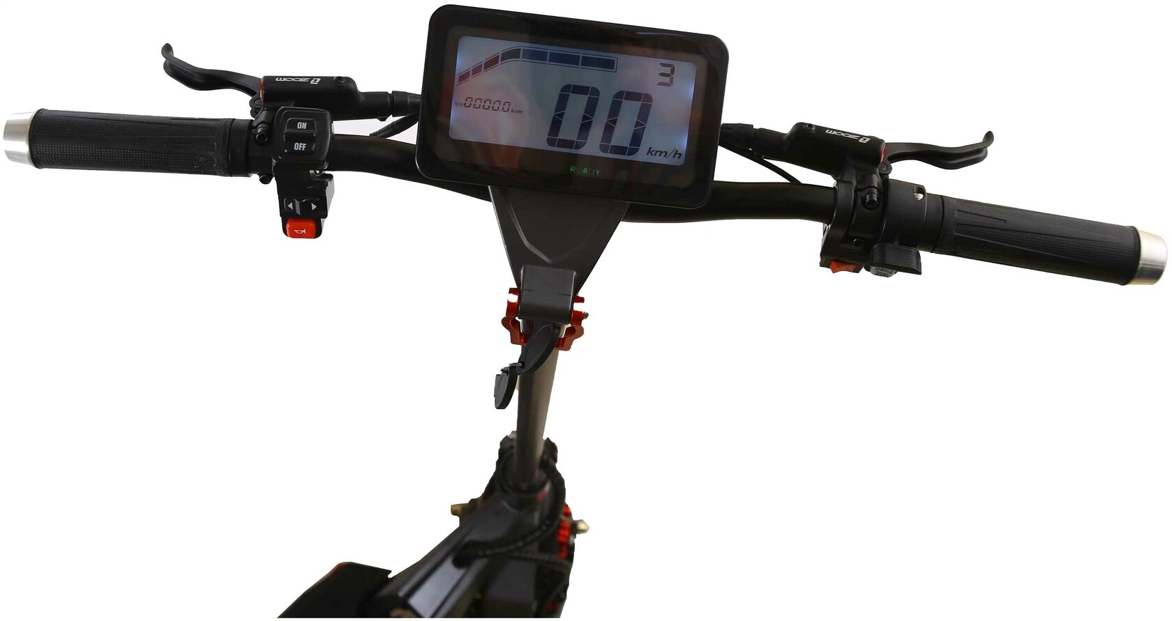 Для поездок по бездорожью не забудьте оснастить скутер внедорожными шинами с глубоким рельефом протектора. Это позволяет без особых усилий преодолевать грунтовые дороги, травянистые местности, песчаные ландшафты и даже липкие почвы. Исключительный внедорожный скутер процветает в любых дорожных условиях, и вы можете удобно переключаться между полным приводом и обычным режимом с помощью кнопки на рулевом колесе. Над газовым курком расположен бортовой компьютер с комплексным табло, который предоставляет важную информацию, такую как скорость, пройденное расстояние, заряд батареи и другие важные параметры.