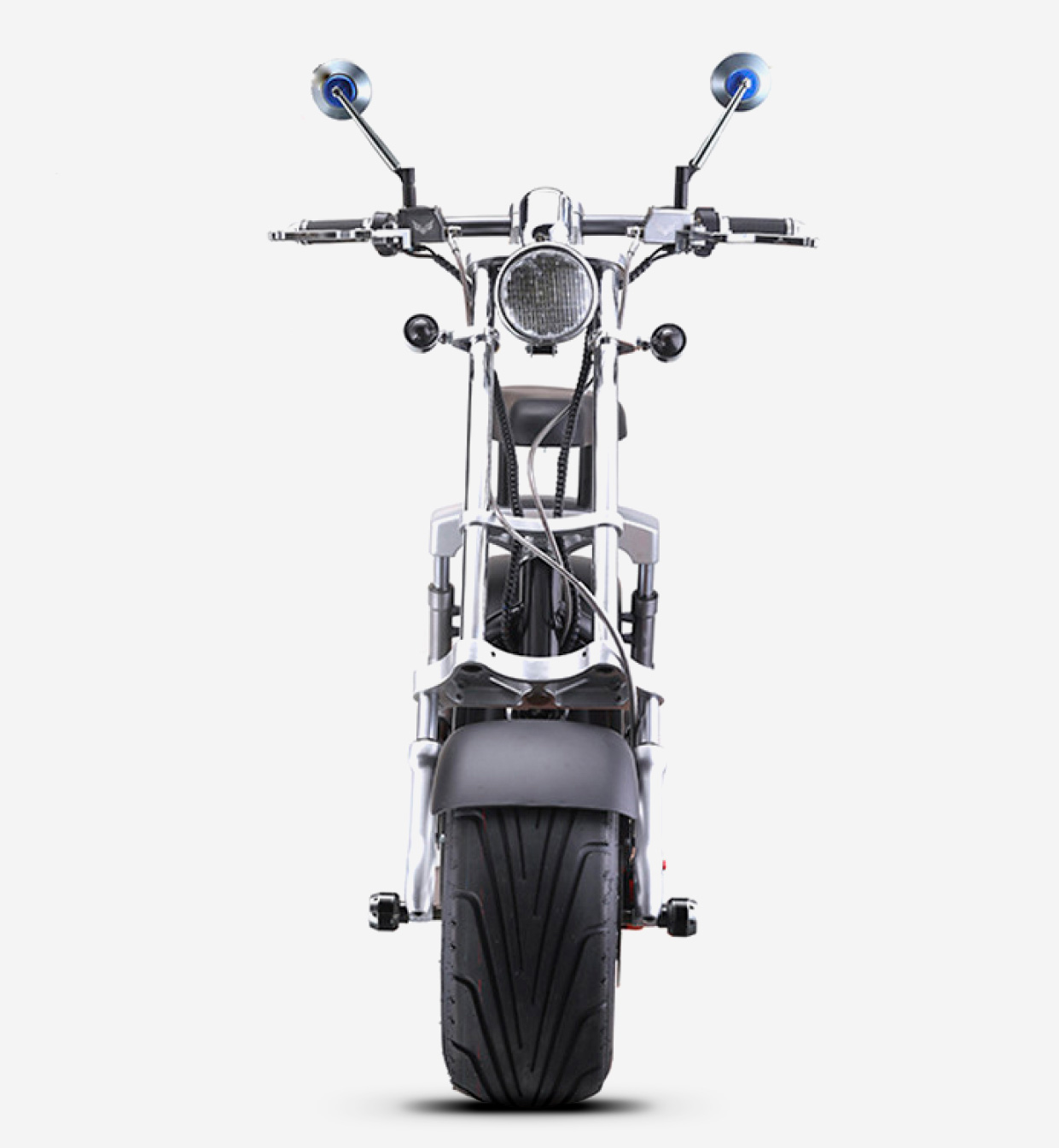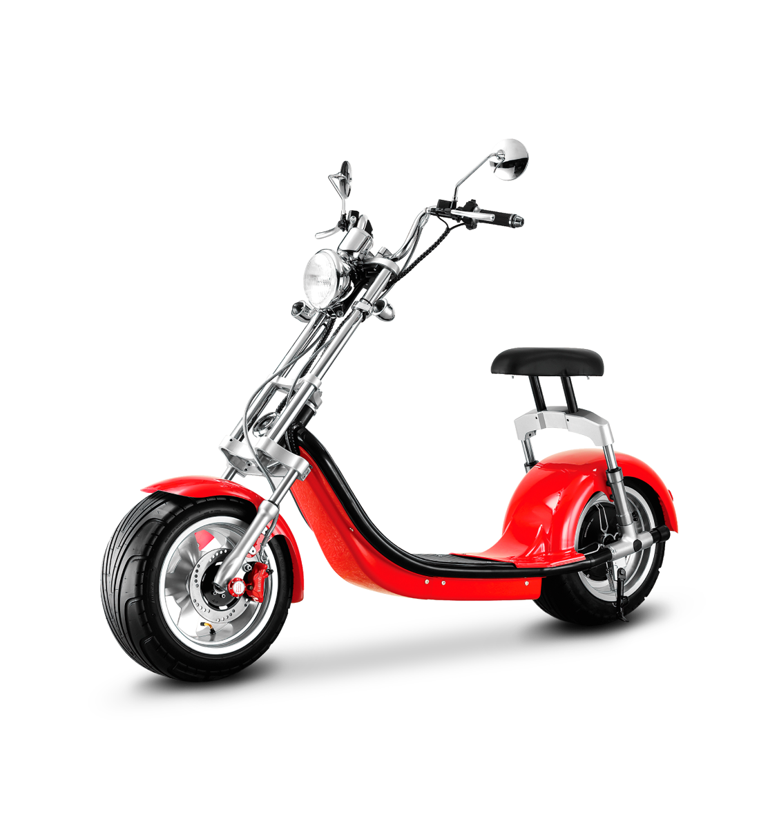 При этом главная «фишка» электроскутера KUGOO C4 – огромные стальные диски на 12 дюймов. Они хромированные, прочные и надежные. Шины широкие, пневматические, легко преодолевают препятствия. Поскольку только собственный вес машины 75 килограмм, а с пассажиром большого телосложения общая масса становится очень серьезной, электроскутер CITYCOCO KUGOO C4 снабжается надежными гидравлическими тормозами.